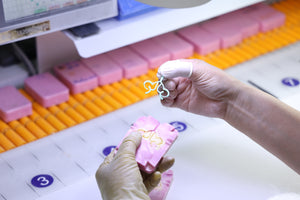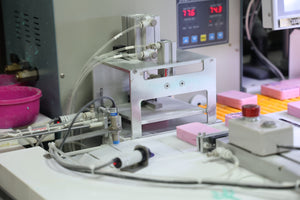 The two halves of the mold are brought together and placed under a liquid casting machine, where molten wax is injected.