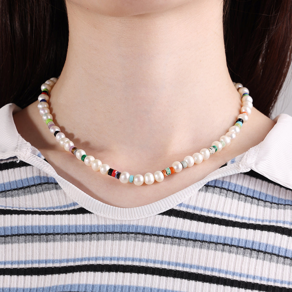 PN0044 6-7MM Freshwater Pearl Rainbow Stone Bead Choker Necklace