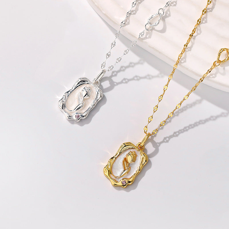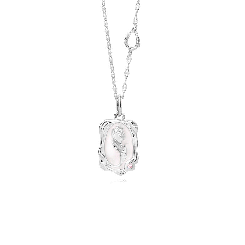 FX1025 925 Sterling Silver Antique Tulip White Enamel Square Pendant Necklaced