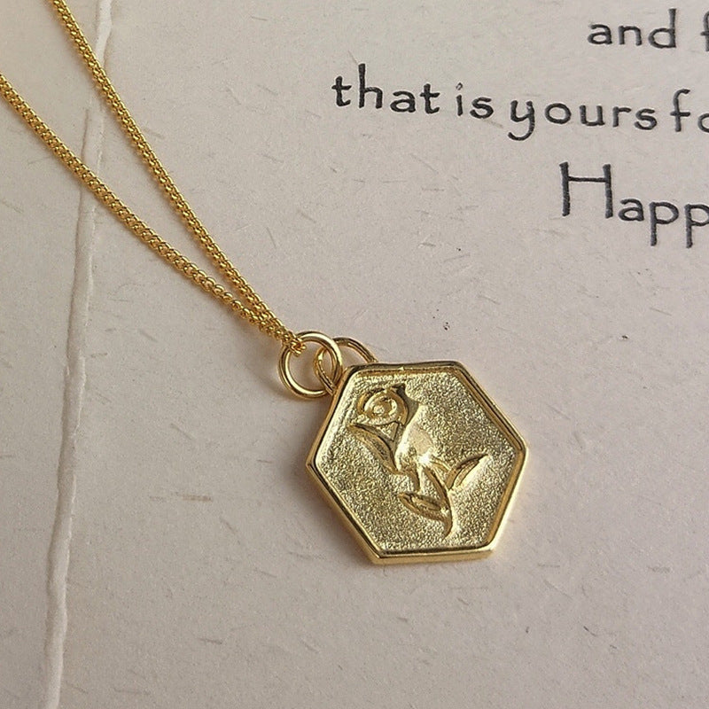FX1057 925 Sterling Silver Hexagon Engraved Rose Necklace