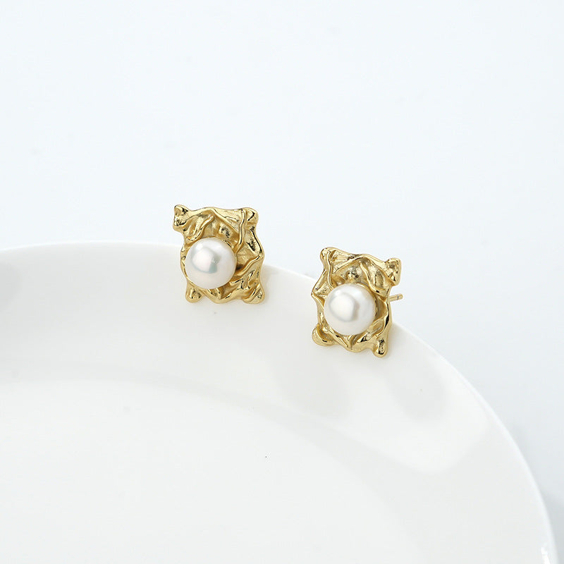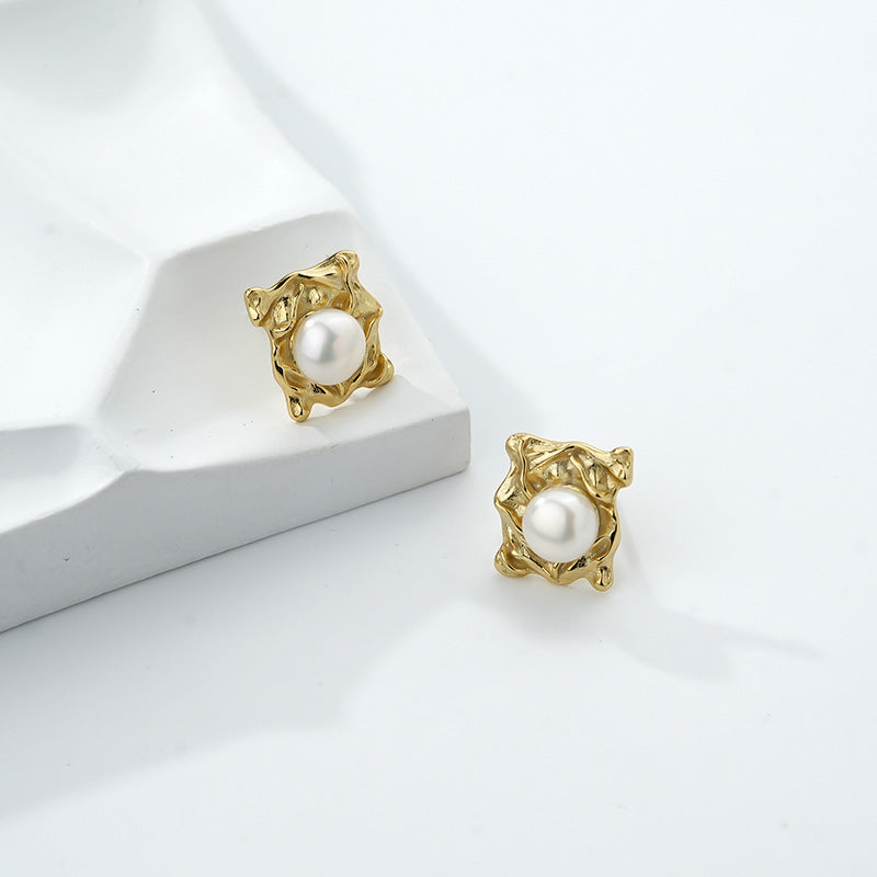 FE2617 925 Sterling Silver Rectangular Pleated Shell Pearl Stud Earring