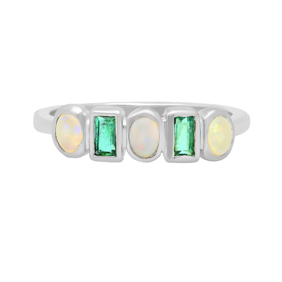 FJ0614 925 Sterling Silver Opal and Emerald Band Ring