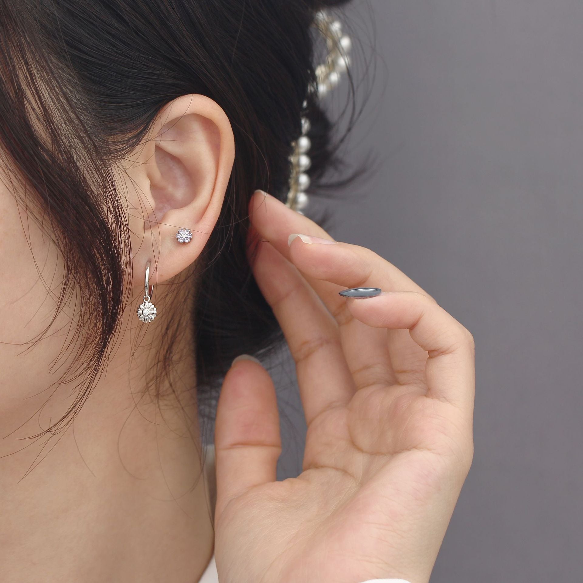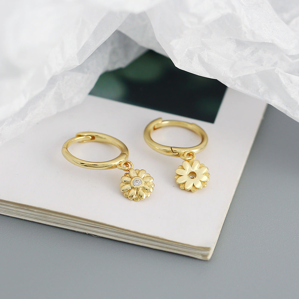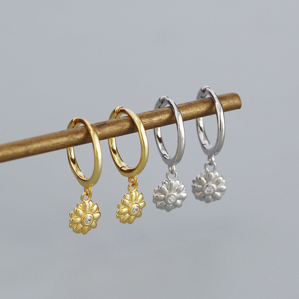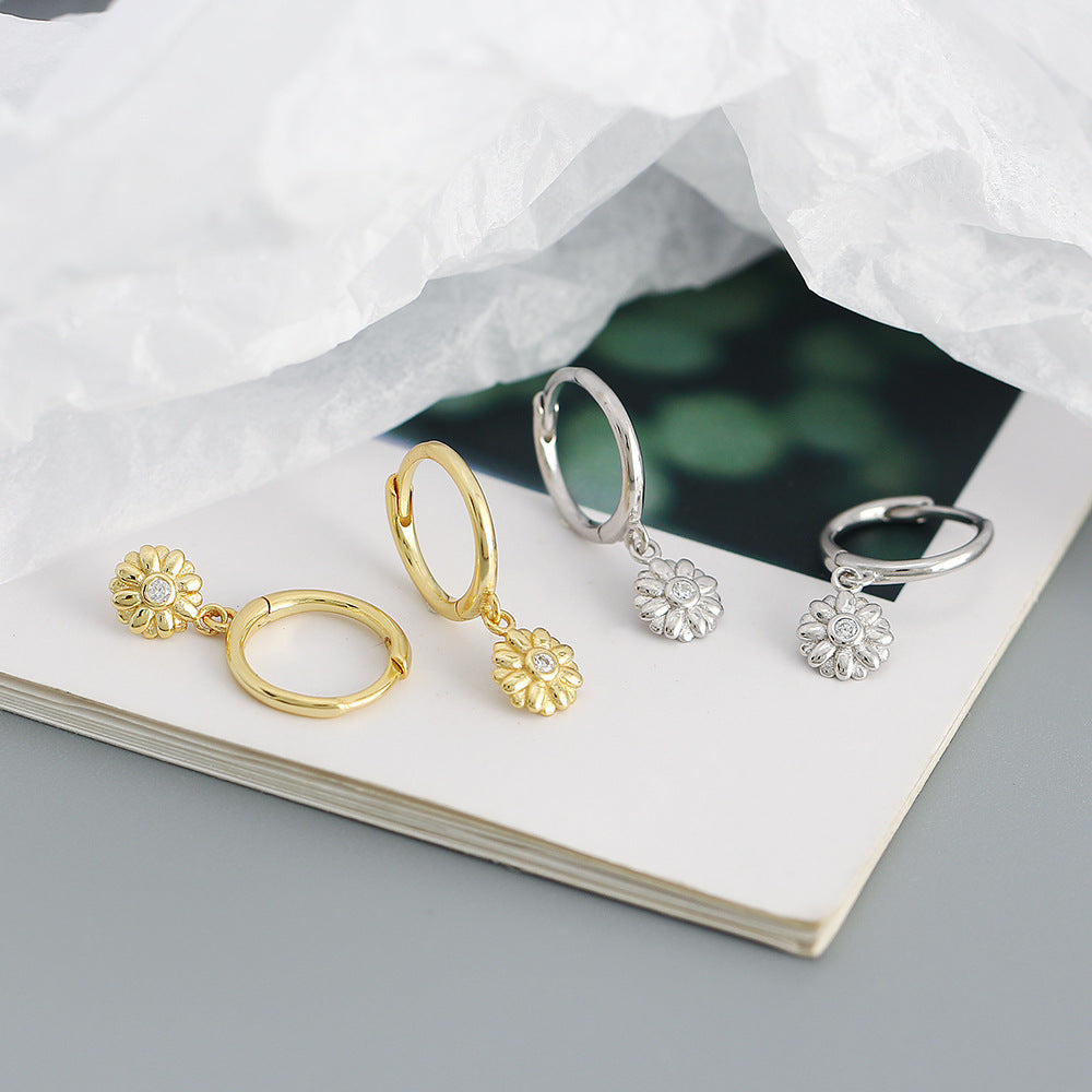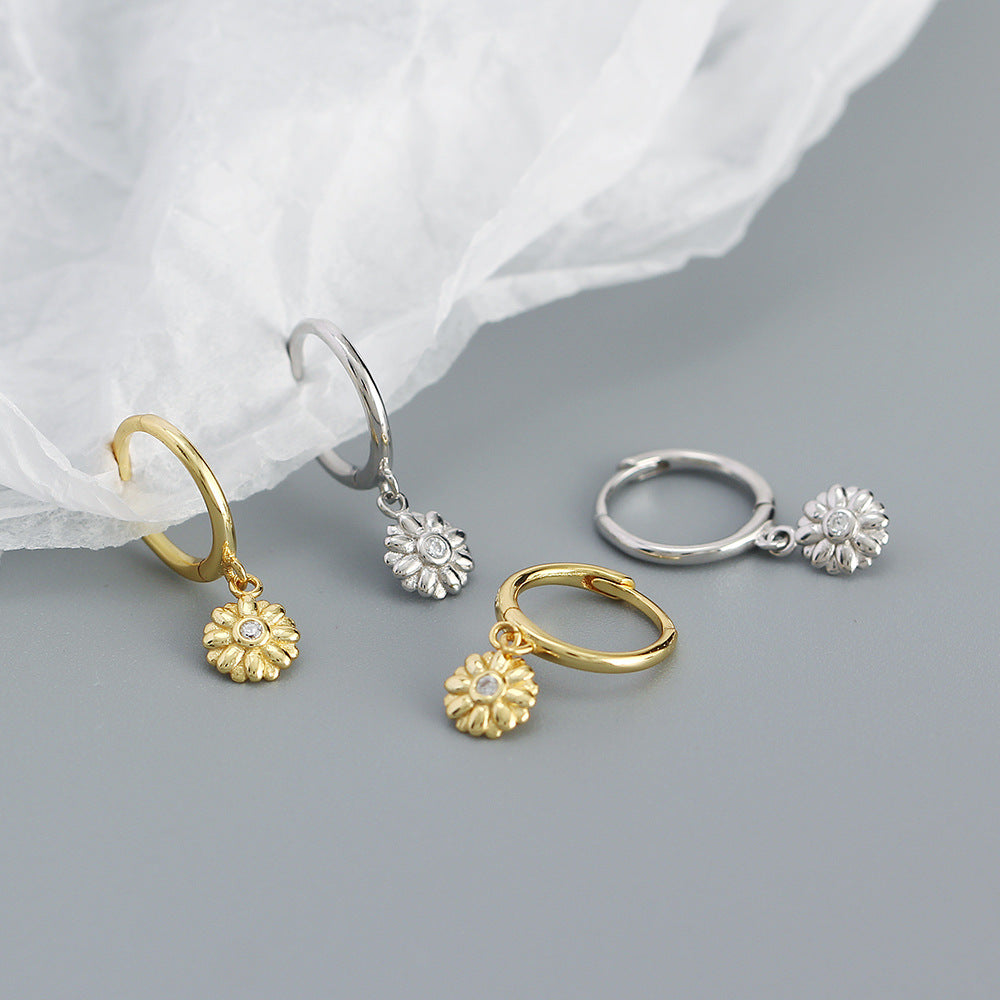 YHE0469 925 Sterling Silver Dainty Daisy Flower Bezel CZ Dangle Hooo Earring